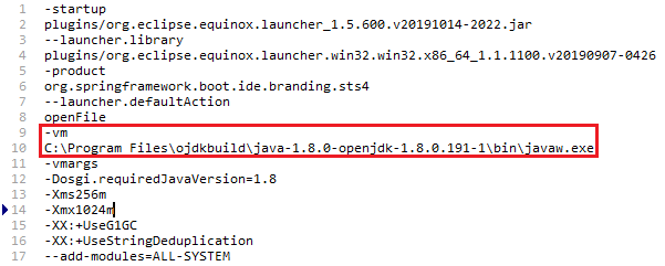 위와 같은 오류 메시지가 발생하고 빌드가 안될 경우 eclipse.ini ( sts의 경우에는 sts.ini 또는 SpringToolSuite4.ini) 를 아래와 같이 수정하여 해결할 수 있습니다.