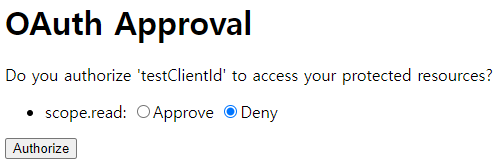 동일한 URL(https://javaengine.tistory.com/entry/Spring-Boot-Oauth2-–-AuthorizationServer [nalaolla]"> http://localhost:8081/oauth/authorize?client_id=testClientId&redirect_uri=http://localhost:8081/oauth2/callback&response_type=code&scope=read)을 호출하여 인증 완료되면 이번에는 다음과 같은 결과를 볼 수 있습니다.