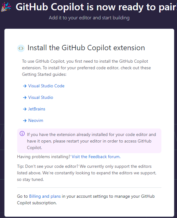 Github Copilot은 코드 자동 완성을 통해 Visual Studio, Visual Studio Code, Neovim, JetBrains 등의 통합 개발 환경 사용자를 지원하기 위해 Github가 2021년 출시한 자동 코드 완성 AI(인공지능)입니다.